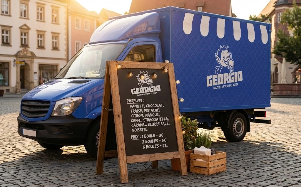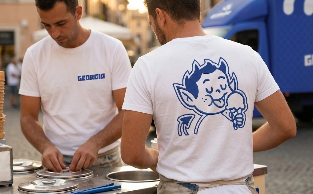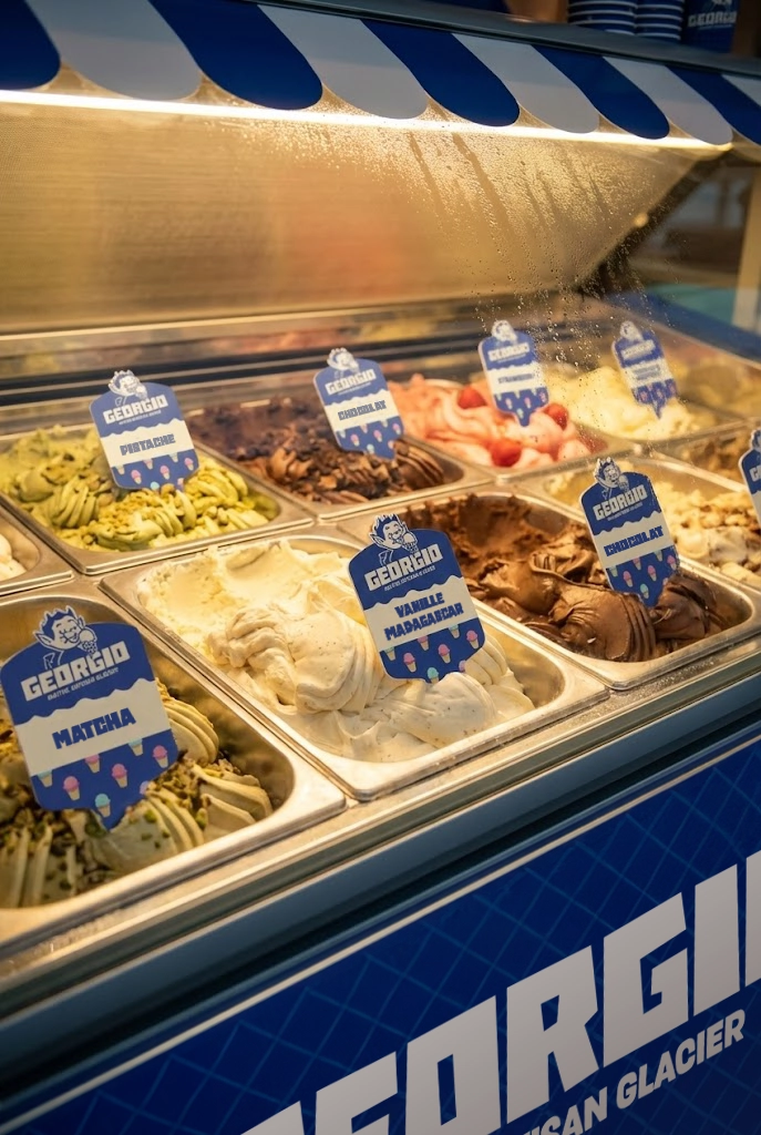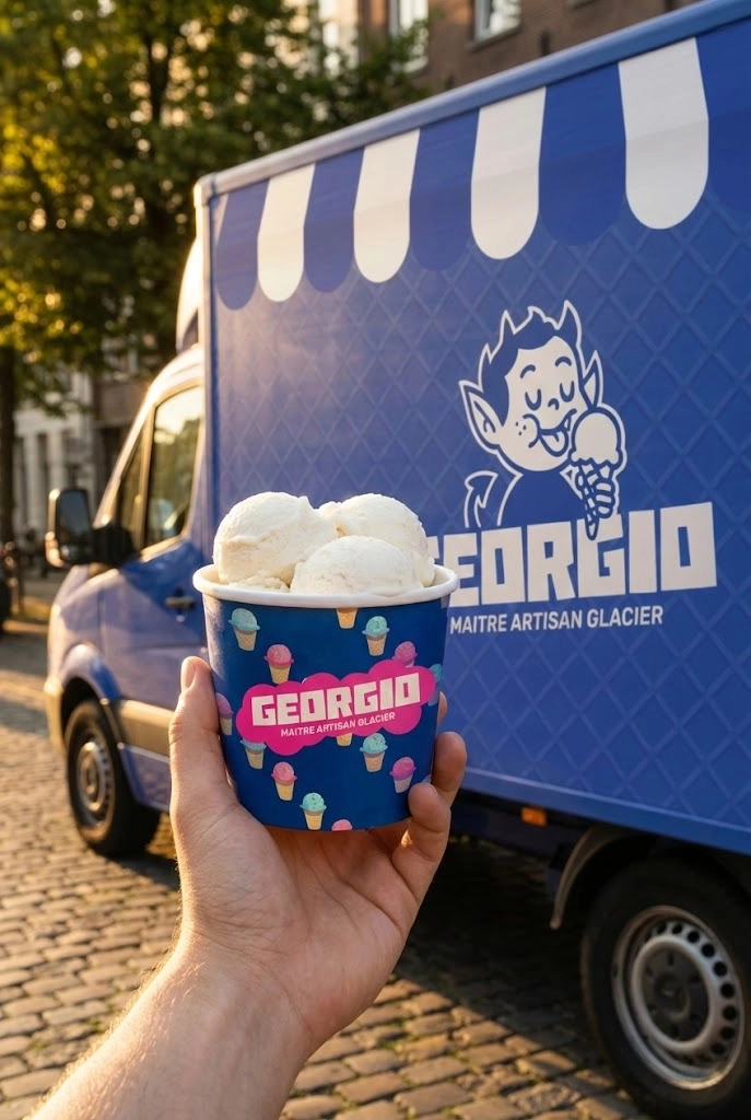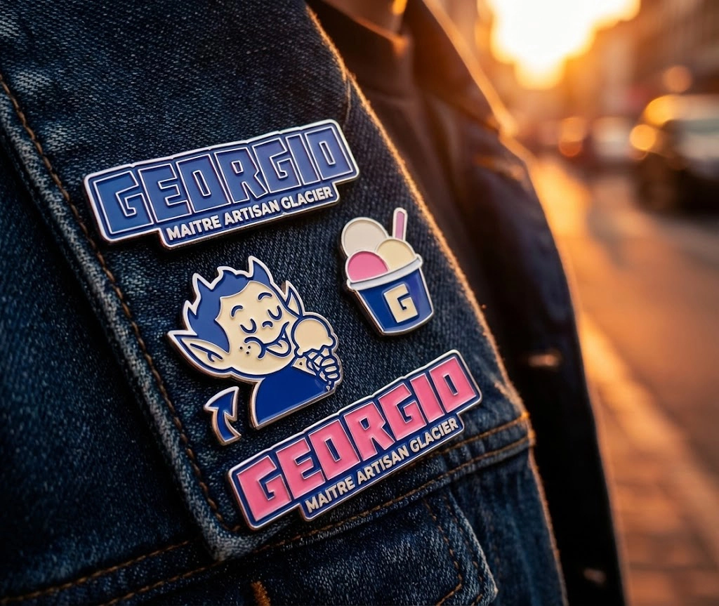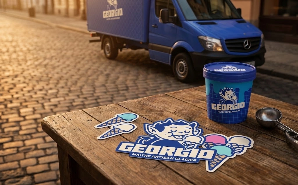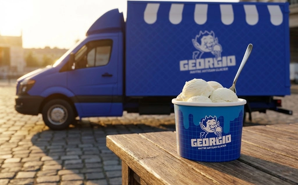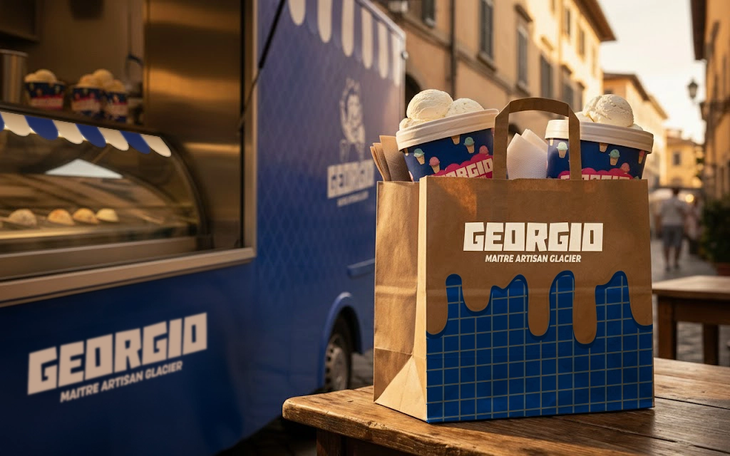 La palette de couleurs, éclatante et dynamique, exprime toute l’énergie de la marque, tandis que le bleu signature de Georgio assure la continuité et la reconnaissance immédiate.