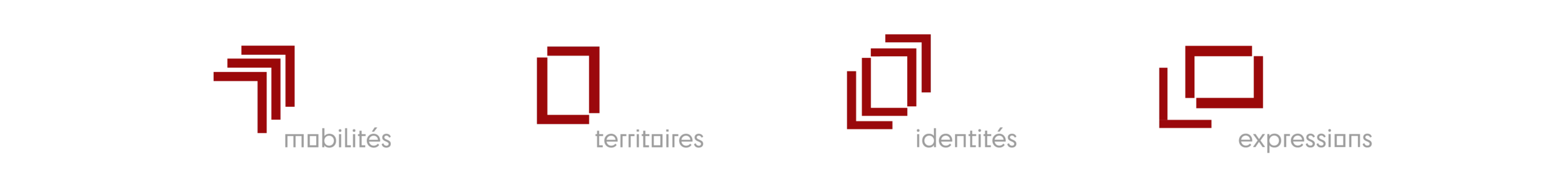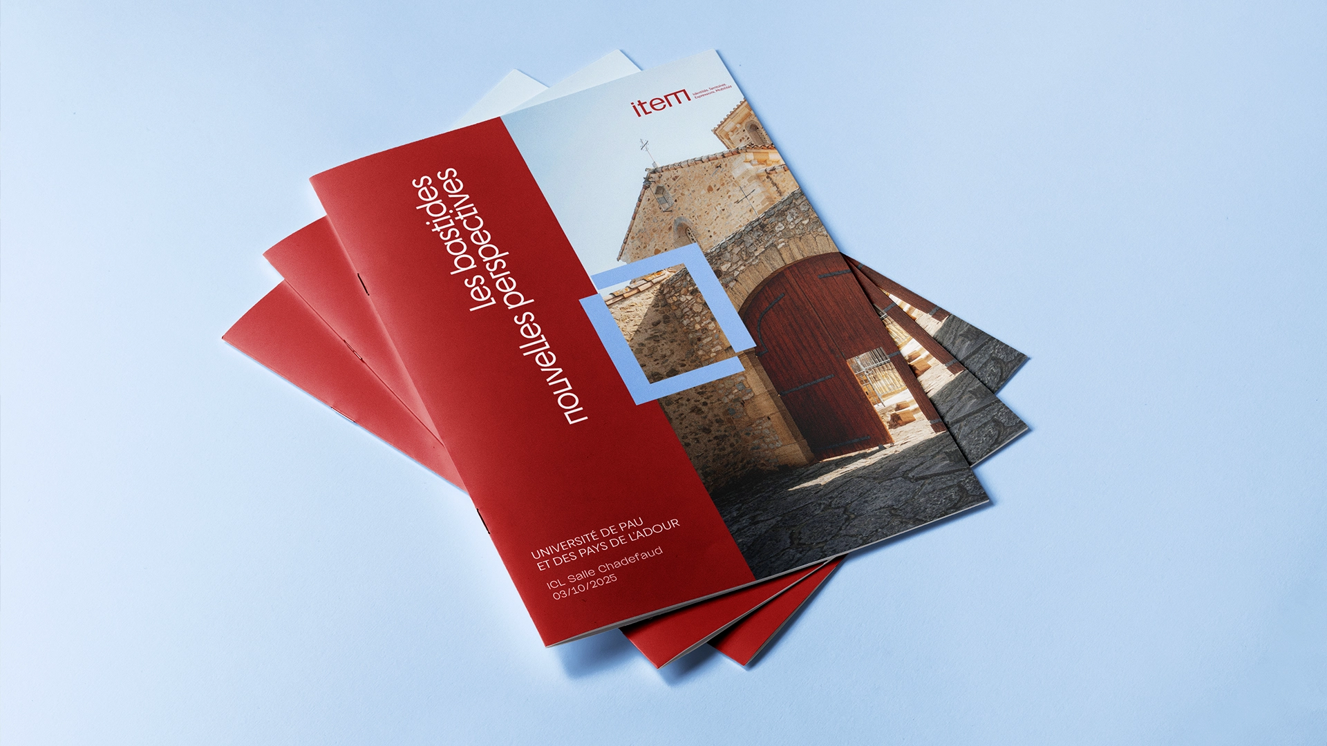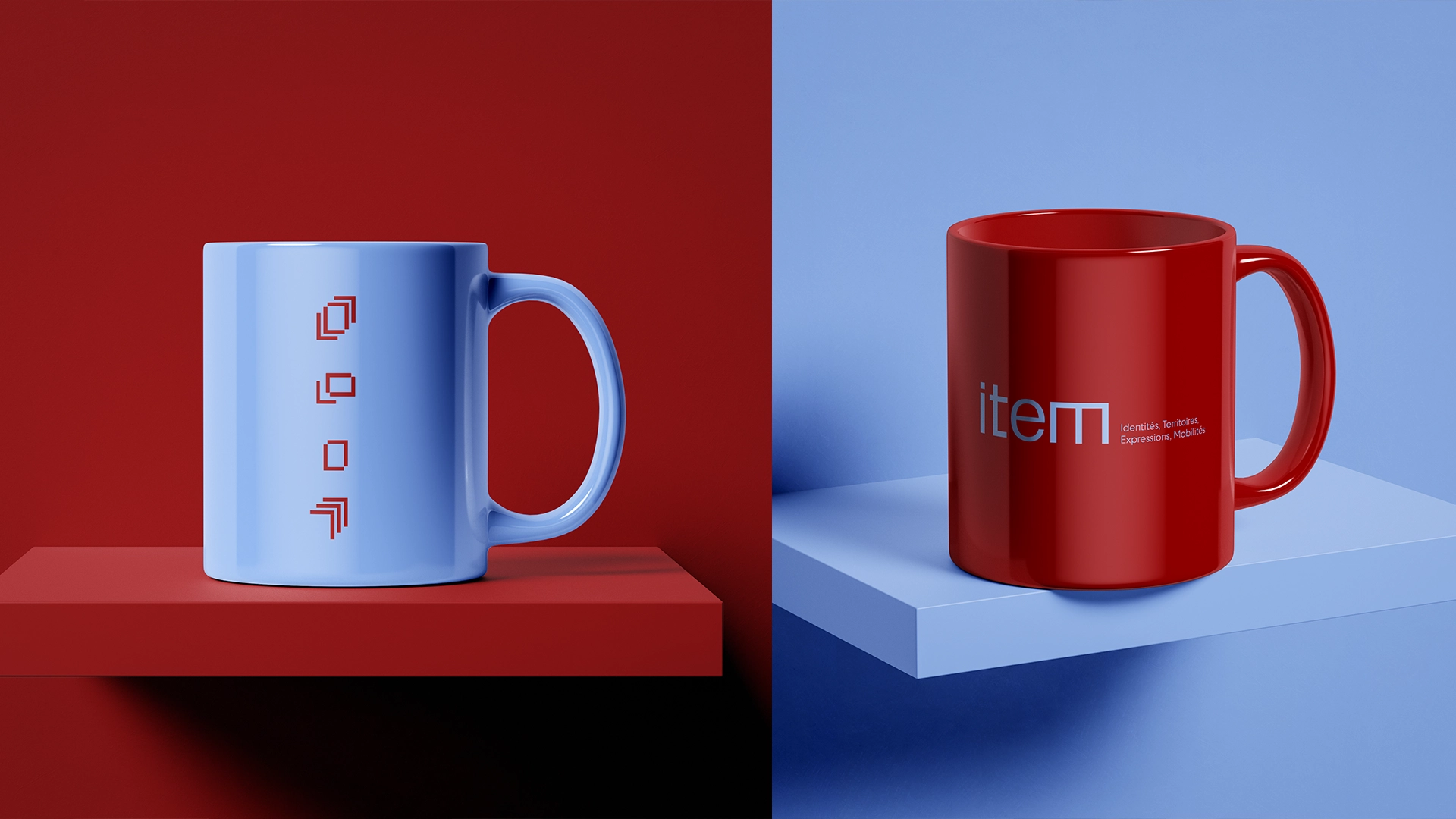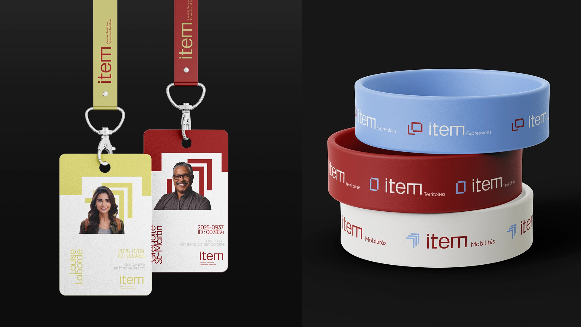 Le logo principal met en avant un jeu d’angles marqués, qui se déploient à partir du « m » final, ponctuant le mot « item » d’une terminaison graphique caractéristique. Cette singularité typographique a été pensée comme un point de départ pour créer un ensemble de signaux visuels appliqués sur tous les modules du système graphique : chaque thématique (mobilités, territoires, identités, expressions) se voit attribuer une déclinaison spécifique, tout en restant reliée à la structure originelle du logo.