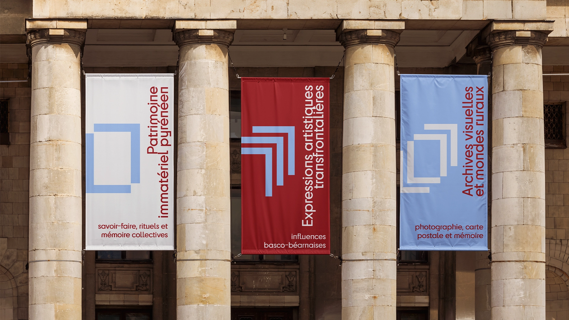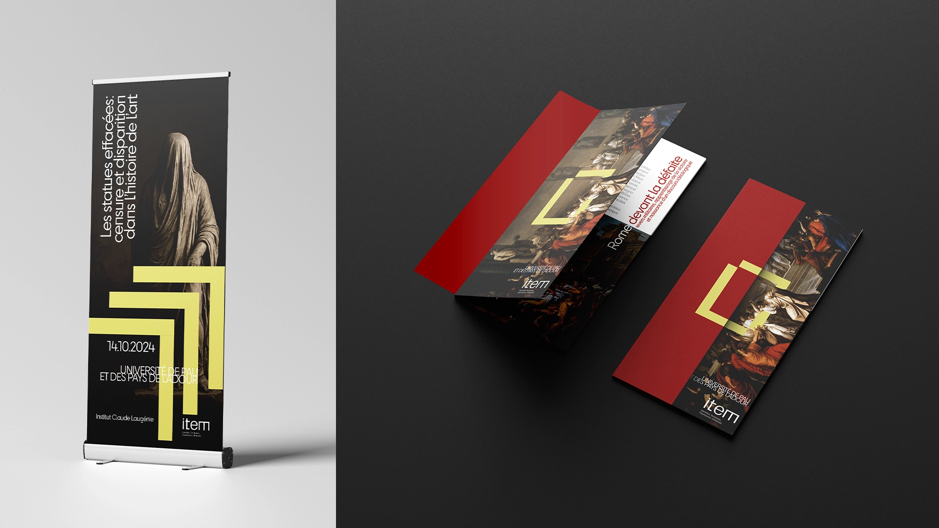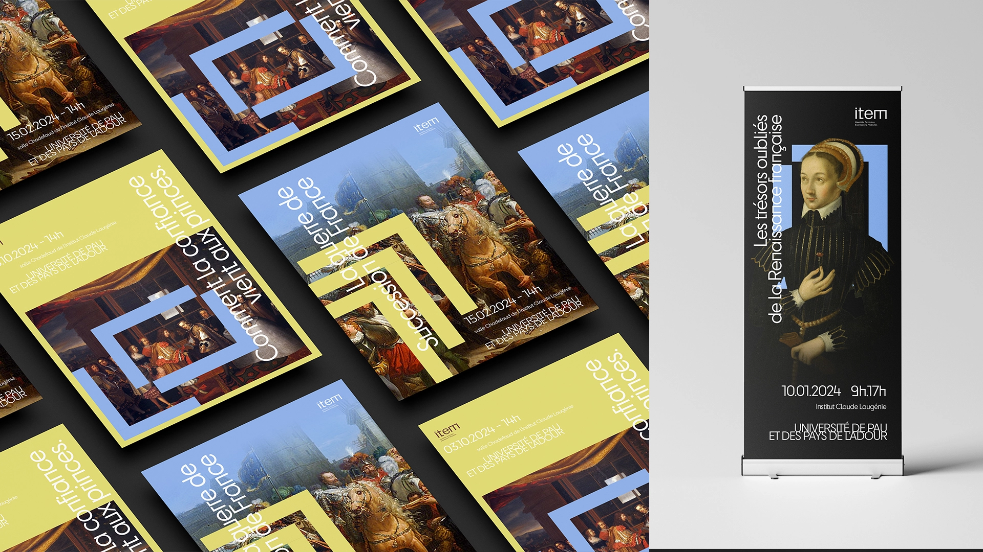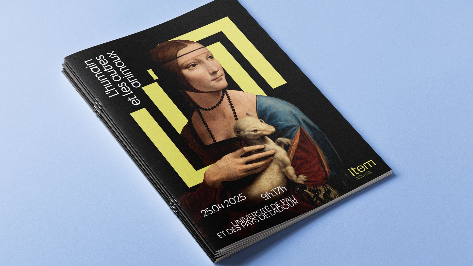 Le logo principal met en avant un jeu d’angles marqués, qui se déploient à partir du « m » final, ponctuant le mot « item » d’une terminaison graphique caractéristique. Cette singularité typographique a été pensée comme un point de départ pour créer un ensemble de signaux visuels appliqués sur tous les modules du système graphique : chaque thématique (mobilités, territoires, identités, expressions) se voit attribuer une déclinaison spécifique, tout en restant reliée à la structure originelle du logo.