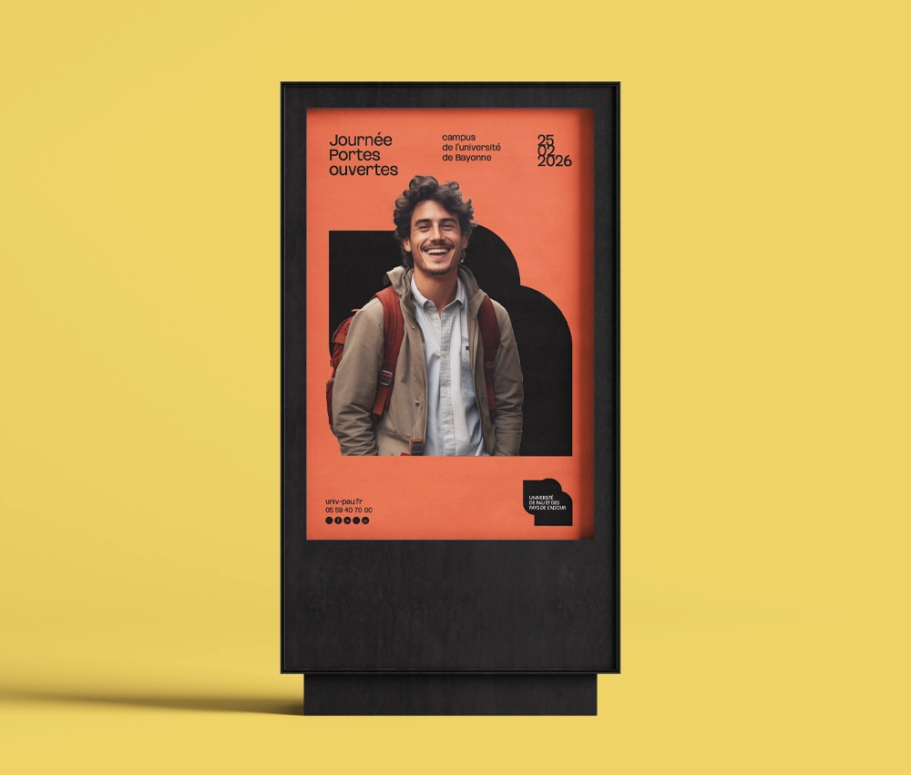 Ce rebranding marque une rupture avec les codes traditionnels, optant pour une palette de couleurs vives et dynamiques, déclinables pour chaque entité de l’université. La modernité se traduit par une approche graphique audacieuse, où les couleurs sont utilisées non seulement comme un outil d’identification, mais aussi pour refléter la diversité des disciplines au sein de l’UPPA. Chaque département ou faculté pourra ainsi se voir attribuer une couleur propre, renforçant ainsi l’individualité de chaque entité tout en restant cohérent au sein d’une identité visuelle globale. Ce choix de couleurs vives, associé à une typographie fluide, renvoie à une université ouverte, inclusive et avant-gardiste, qui s’engage pleinement dans son époque.